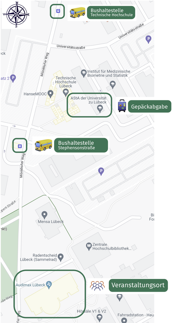 Ihr reist mit der Bahn an? Bucht euch ein Ticket bis Lübeck Hbf, von dort könnt ihr dann mit dem Bus zur Veranstaltung kommen. Die passenden Verbindungen und Pläne folgen demnächst.